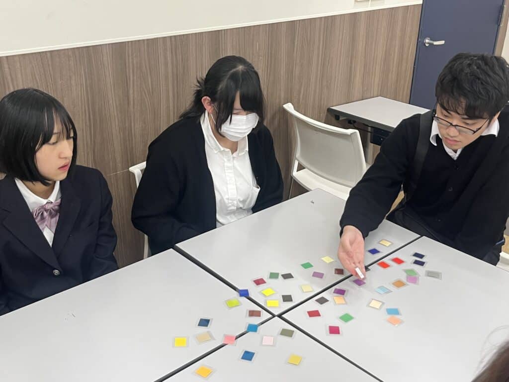 後半はグループワークを実施。チームごとに「温かみのある印象」「スタイリッシュな印象」などテーマを設定し、配色を検討する活動を行いました。選んだ色の組み合わせが人に与える印象を話し合いながら、自分では思いつかない視点や表現の幅を学ぶ姿も見られました。互いの感性を尊重し合うことで、デザインにおける多様なアプローチを体験的に学ぶ時間となりました。