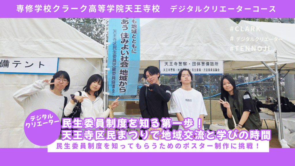 クラーク天王寺校のデジタルクリエーターコースは、プロのクリエイターから直接指導を受け、アナログとデジタルの両面から技術の向上を図りながら、楽しんで学べることが魅力です。 【探究学習】民生委員の活動を体験!デジタルクリエーターコースが地域の... -