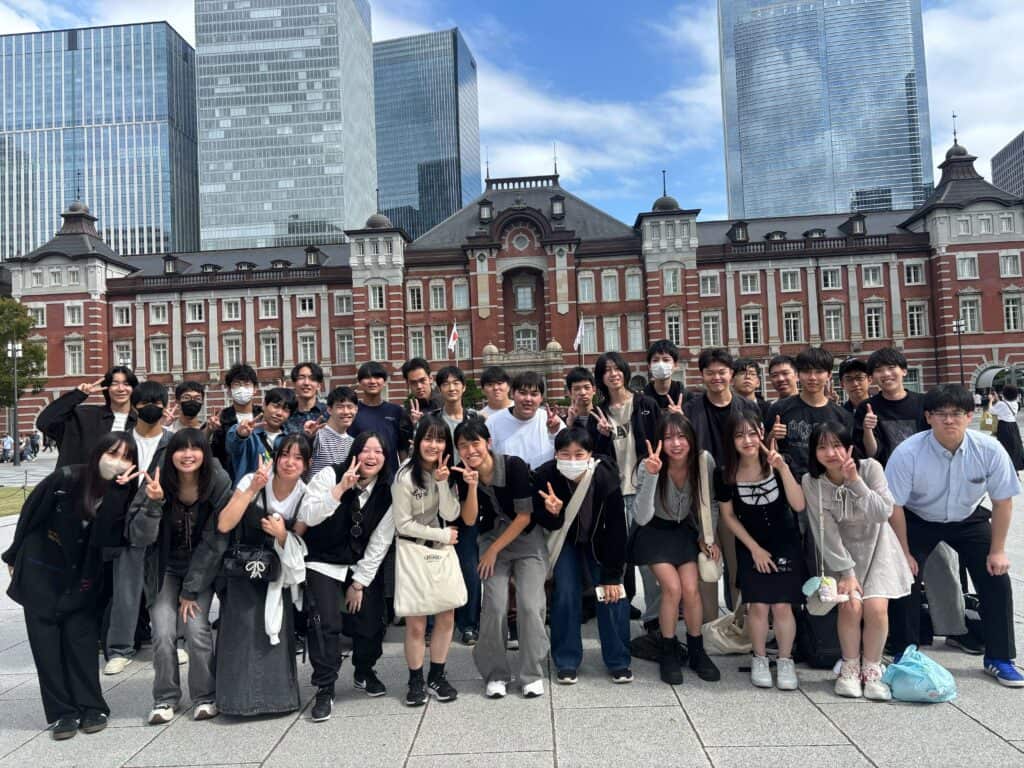 赤レンガ駅舎を背景にクラス写真&自由撮影📸旅の思い出を象徴する1枚になりました。天気も少しずつ回復し、東京の街並みをバックに笑顔がはじけます。
