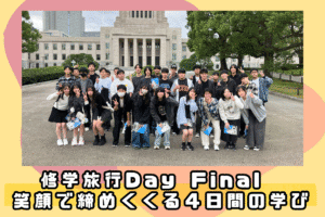 明日はいよいよ修学旅行最終日。国会議事堂や東京スカイツリーなど、日本の「今」と「未来」を感じる1日が待っています。最後の最後まで、仲間と一緒に全力で楽しんでほしいと思います!