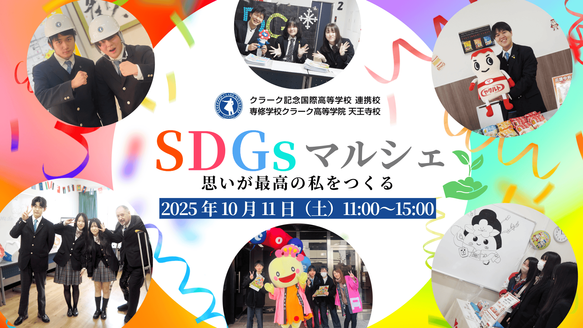 クラーク天王寺校では、総合進学コースが主体となり、地域の皆さまと共にSDGsを身近に感じていただけるイベント「SDGsマルシェ」を今年度も開催いたします。小さなお子さまからご年配の方まで、どなたでも楽しみながらSDGsについて知っていただける内容となっています。ぜひお気軽にお越しください!