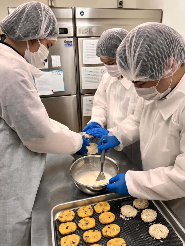 このコロッケは大阪産のじゃがいも、玉ねぎ、そして2種類のきのこを使用。 調理は、慣れない作業も多くありましたが、企業の方に一つ一つ丁寧に教えていただきながら進めていきました。