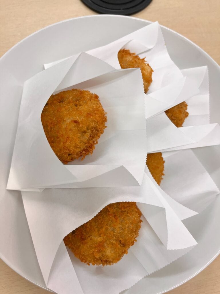 揚げたてのコロッケを試食させていただくと、生徒たちからは「美味しい!」という声が次々と上がりました。さらに、社長にも試食していただき、「きのこの旨味がしっかり出ていて美味しい」とのコメントをいただくことができました。