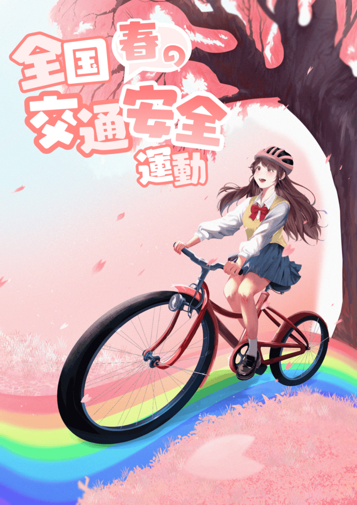 本デザインは、4月1日から導入された自転車の交通違反に対する青切符制度にあわせ、ヘルメットを着用して自転車に乗る高校生の姿を描いたものです。交通ルールを守る意識や安全行動の大切さを、親しみやすいイラストで表現しました。
