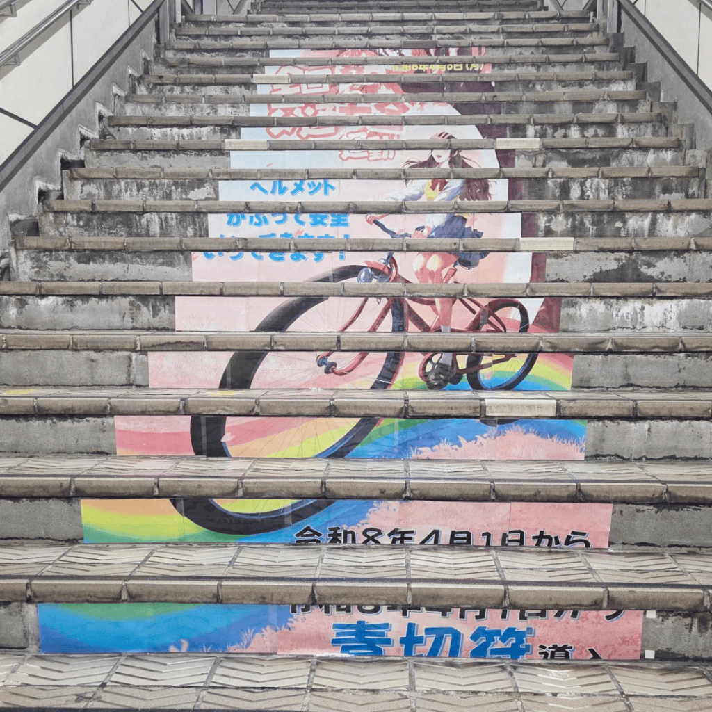 クラーク天王寺校デジタルクリエーターコースの生徒が制作したデザインが、春の全国交通安全運動の一環として、Osaka Metro「四天王寺前夕陽ヶ丘駅」の階段広告に採用されました!