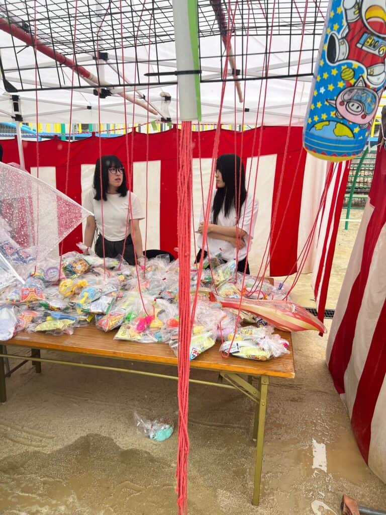 準備段階では順調でしたが開催宣言と同時に雨が降ってきてしまいグラウンドのブースは総移動となりました。グラウンドに水がたまりぬかるんでしまい汚れながら移動作業を頑張ってくれました。