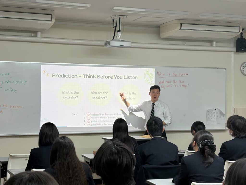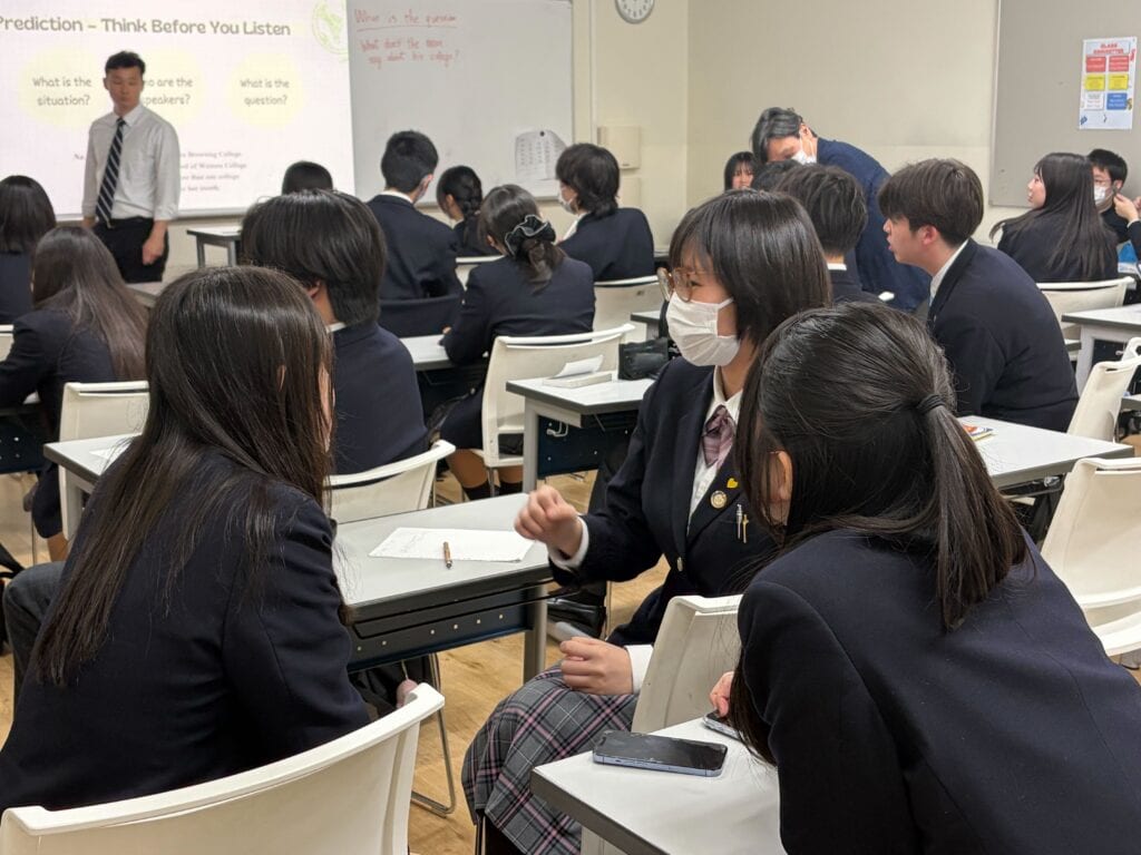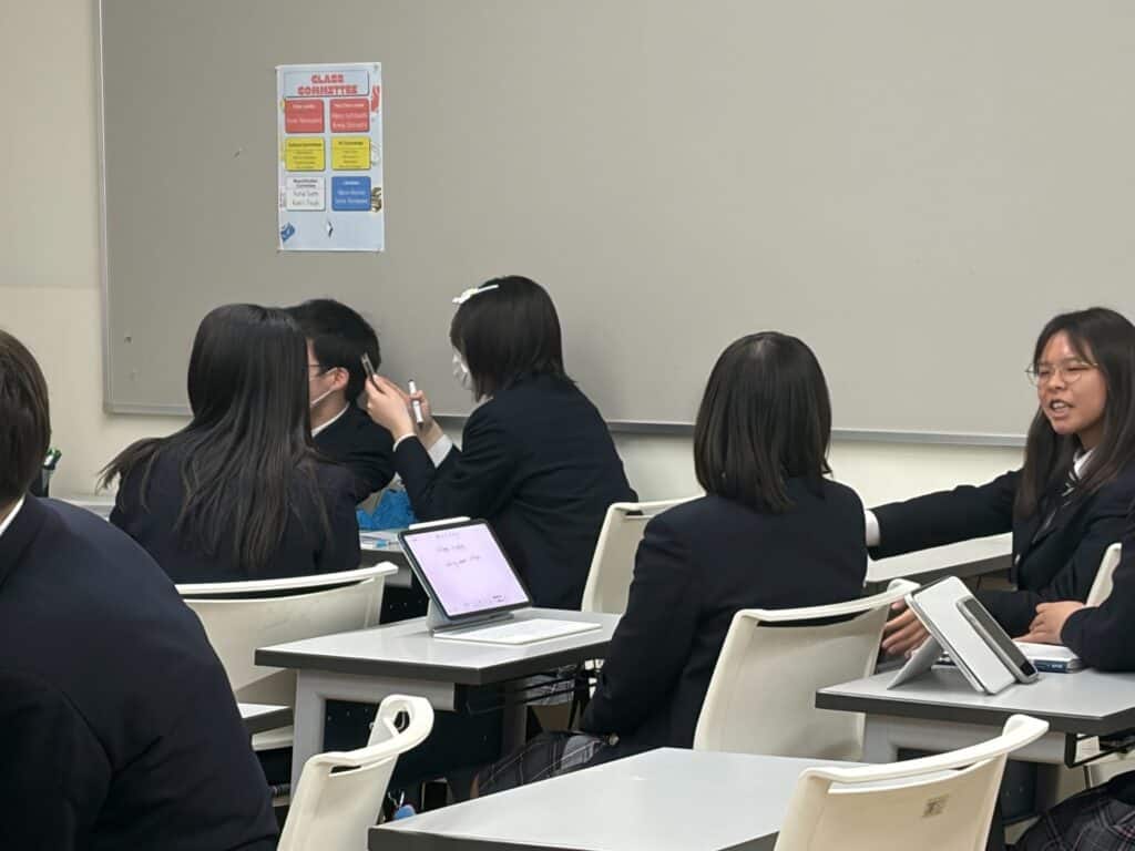授業では、インターナショナルコース以外の生徒も、ネイティブ教員による指導を受けることができます。授業の中で実際のコミュニケーションで使われる“リアルな英語”に触れています。自然なスピードの英語を聞き取る力や、自分の考えを英語で表現する力を養いながら、実践的なリスニング力・スピーキング力を高めています。