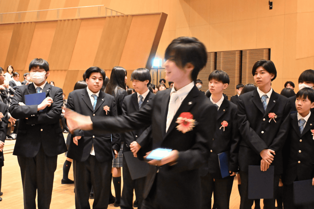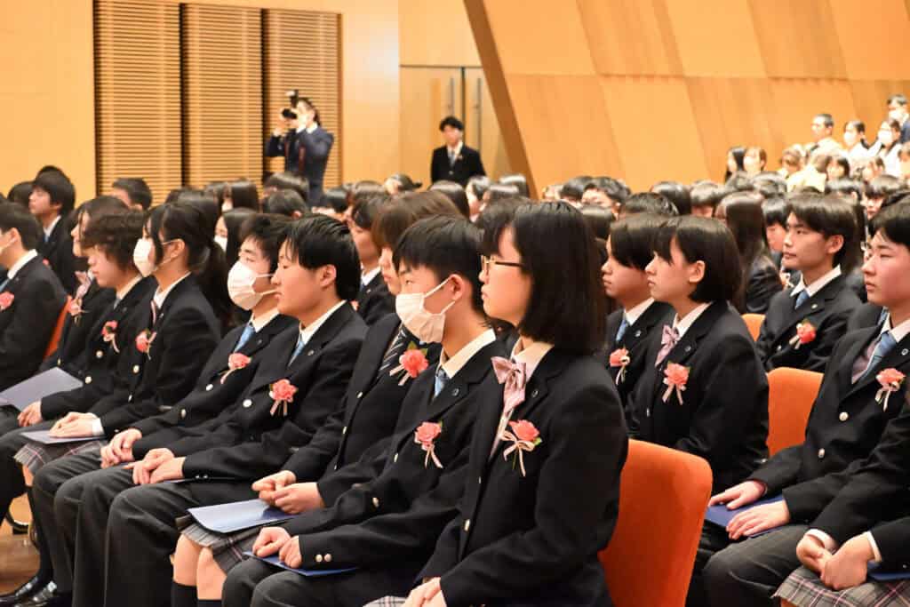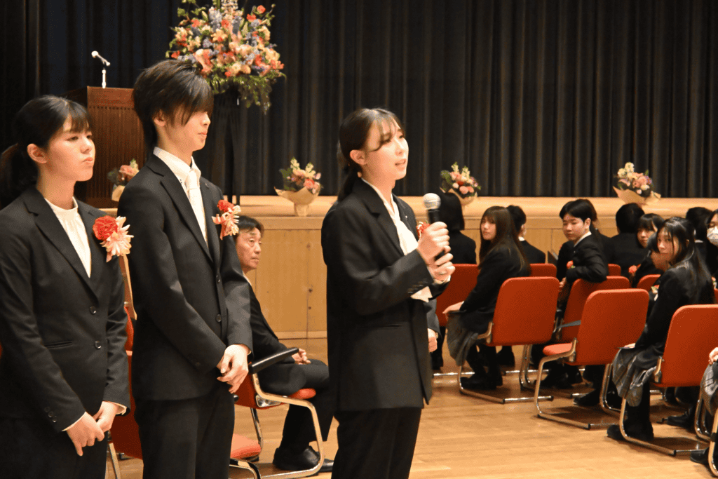 式では、校長先生からの言葉や在校生からの歓迎のメッセージが送られ、新入生たちは真剣に耳を傾けていました。
